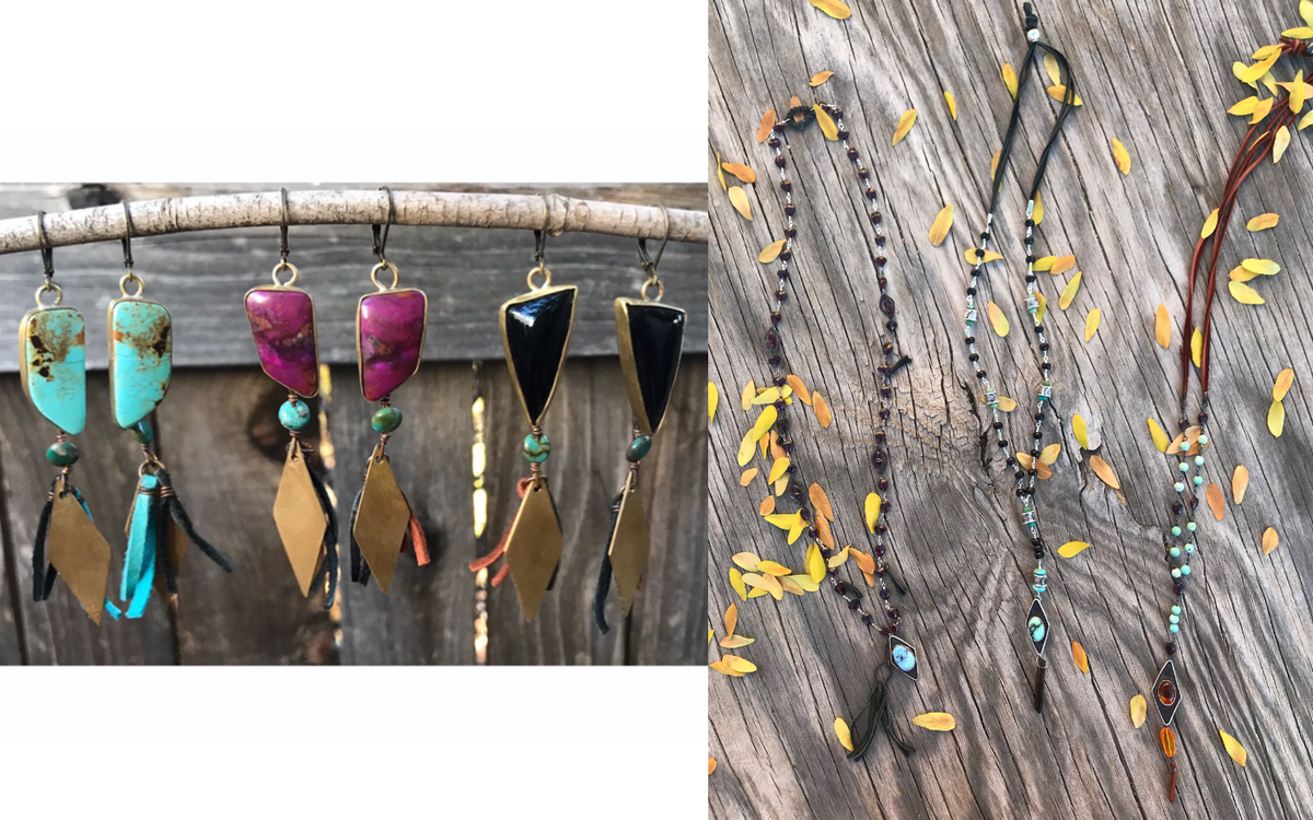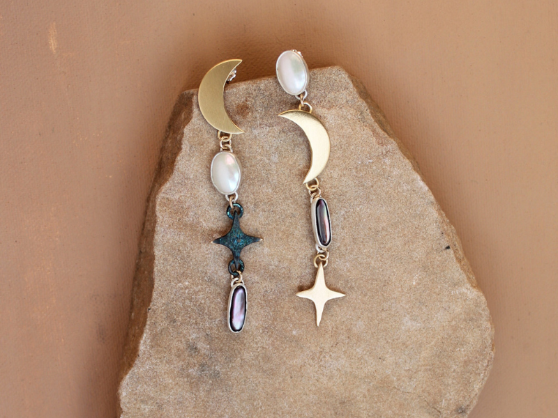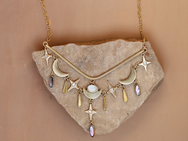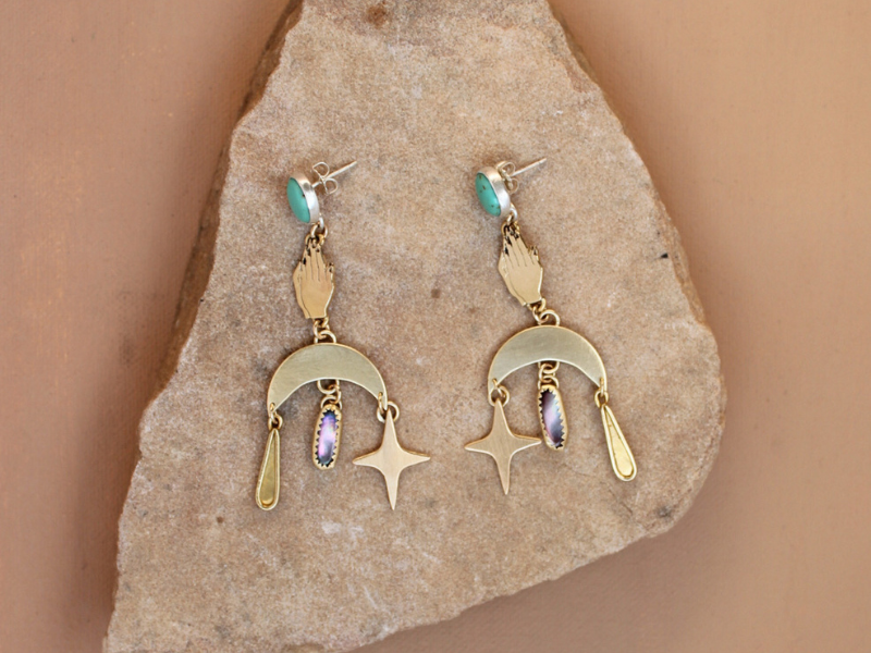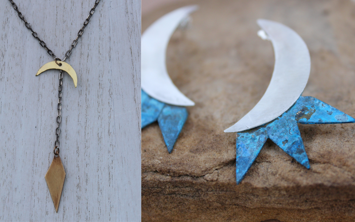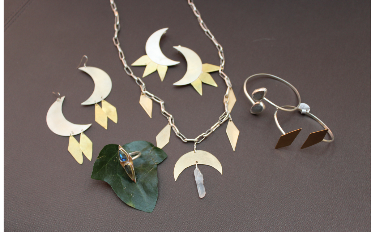 When I was an eager newbie metalsmith having just finished taking 1.7 introductory courses, I was selling my work at a boutique near downtown Santa Fe that I worked at part-time. I was so excited to share my work with practically anyone who walked in the door. It was around this time in 2018 that I put together my first cohesive line. I was reading several basically ‘spirituality-for-dummies’ books and deep diving into metaphysical properties of stones/crystals too. Naturally in my whimsy curiosity, I gravitated towards the classic witchy/spiritual symbolism of stars and moons. In the images of these works you can see some simple sawed out patterns in various arrangements with gemstones and crystals. I still greatly struggled with my jewelers saw and each shape successfully cut out and filed were absolutely a labor of love.