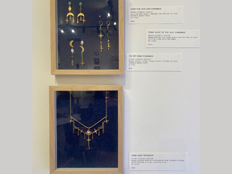 Fast forward to a show I was invited to be a part of in December of 2024 at Lapis Room Gallery. The theme was ‘Celestial Beings’. I took a similar approach of lots of hand-sawing, carefully chosen gemstones, and whimsy as well. This time I focused a lot more on balance, asymmetry, and play. I wanted to take this opportunity to create a line for a sake of sparking joy. As a full-time artist, one of my challenges is sticking to a distinctive aesthetic and works that go with each other. This is something I take a lot of pride in as well, since it can take many years for established artists to create their own artistic voice. In addition to that, I make sure to only use designs and motifs that all have a personal meaning to me. Having said that, being able to explore a subject that is outside of that common theme is a lot of fun creatively. Here are the current works that are in Lapis Room Gallery.