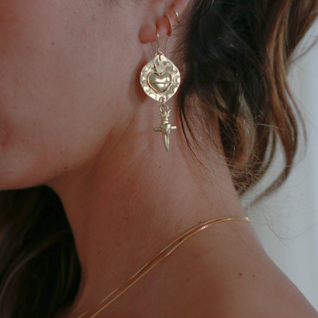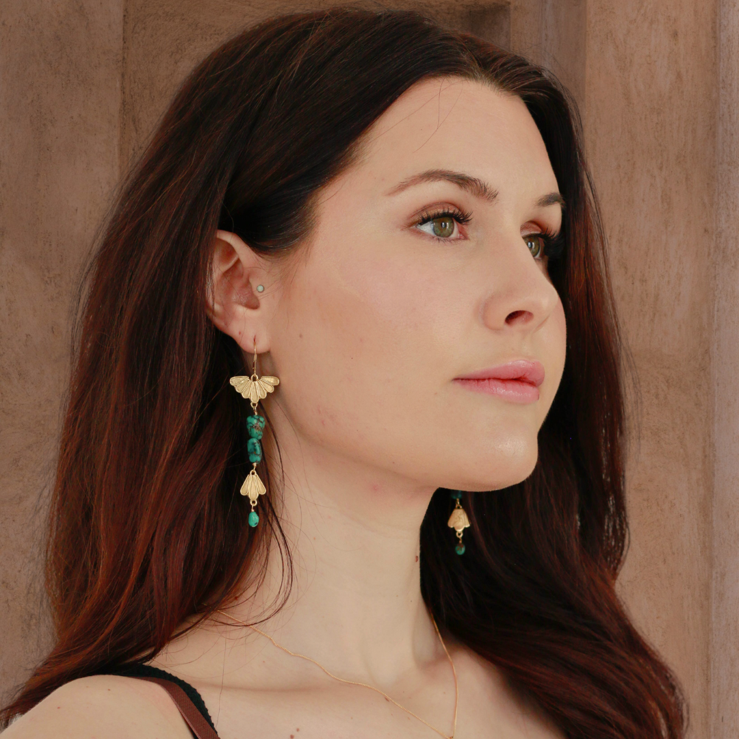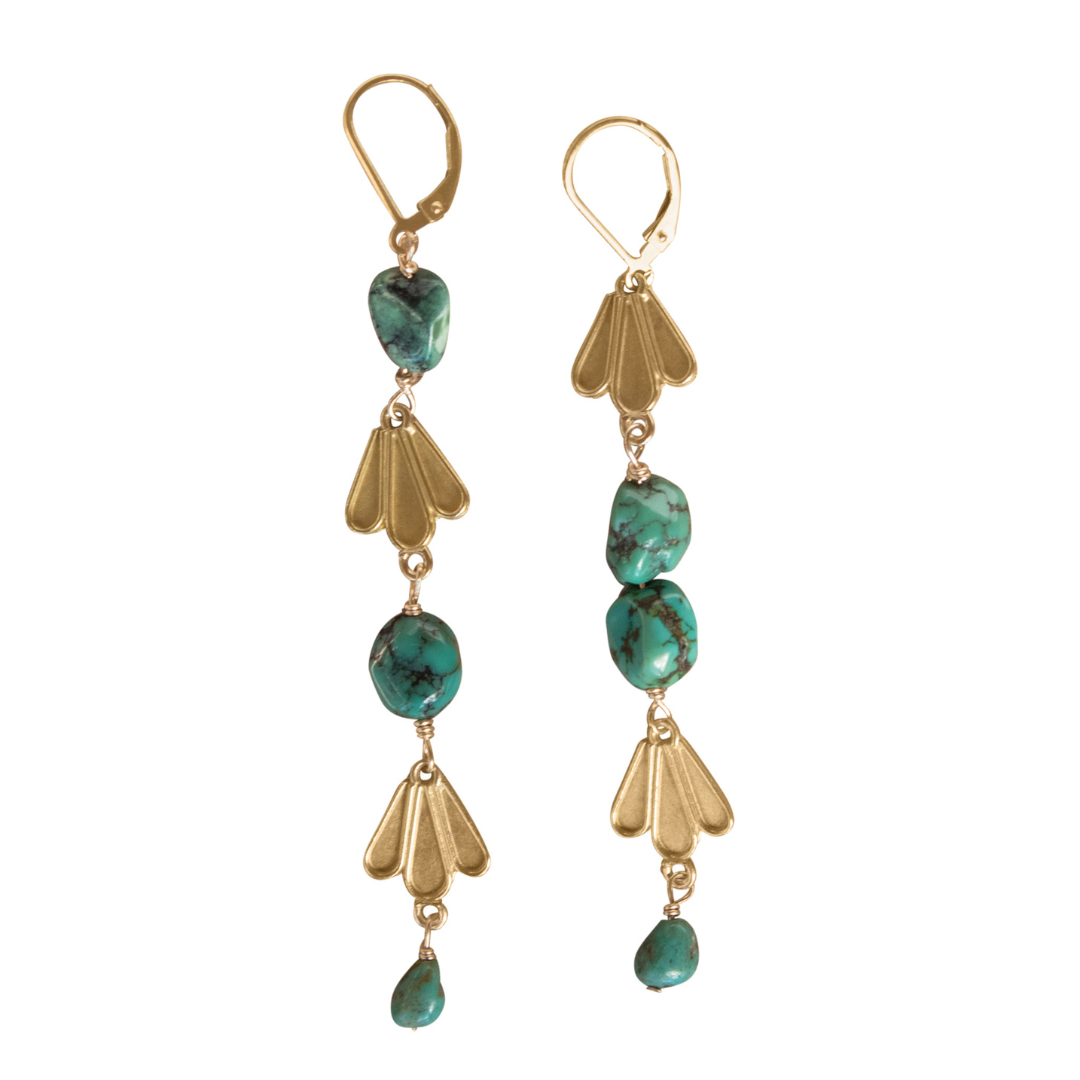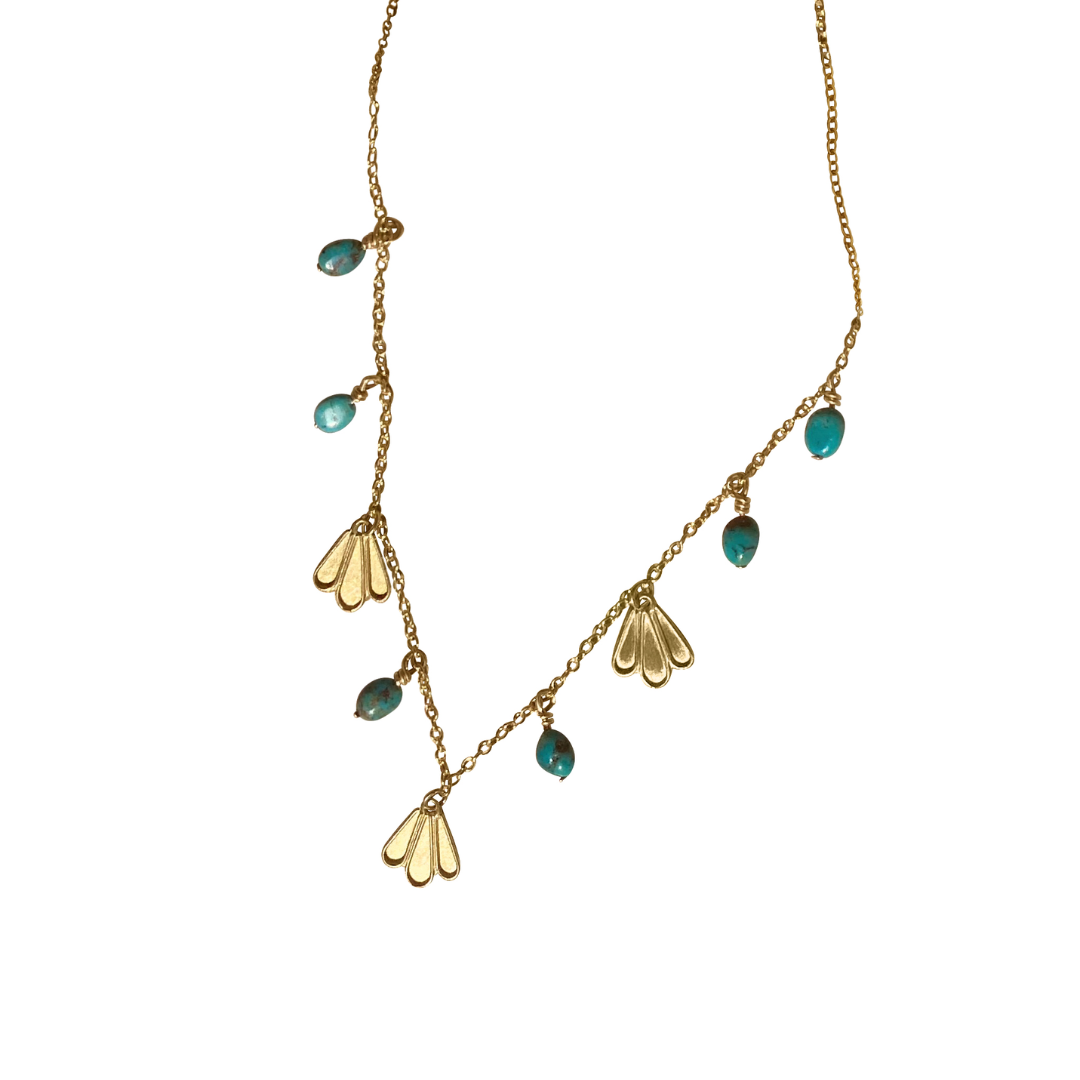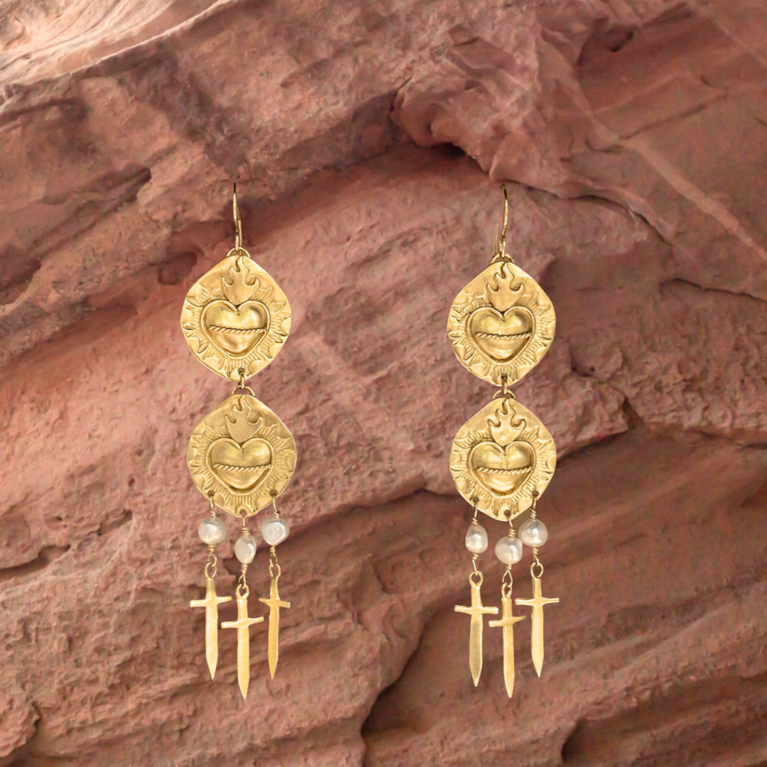 From Left to Right: The Dagger with Heart Necklace is a talisman of protection and a reminder of your strength. The Asymmetrical 3 Rays Dangles are elegant yet whimsical with genuine turquoise and contrasting gold tones. The Divine Charm Turquoise Necklace is a fun southwest take on a charm necklace.